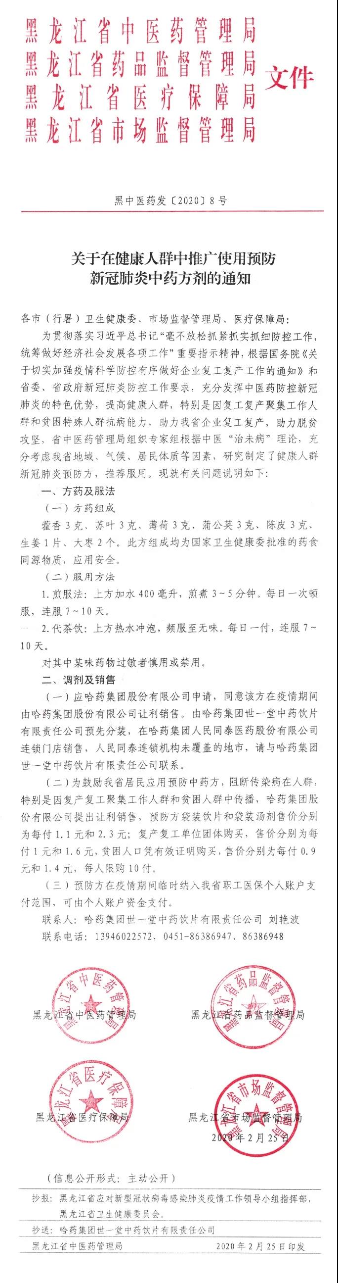 应哈药集团股份有限公司申请,经与省药品监督管理局、省医疗保障局和省市场监督管理局协商决定,此方由哈药集团世一堂中药饮片有限责任公司提供精良饮片,在人民同泰连锁门店让利销售,分别推出让利价、复工复产团购价和贫困人口折扣价。(详情见附件)